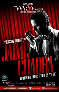 Ago. 2, 2012: En cantante peruano y embajador de la Marca Perú, Jaime Cuadra, estará presentado en Coral Gables. El intérprete de Cholo Soy estará deleitando con su buena música en Mixtura ‘Peruvian Fusion Cusine’ de Coral Gables el próximo Jueves 9 de Agosto.