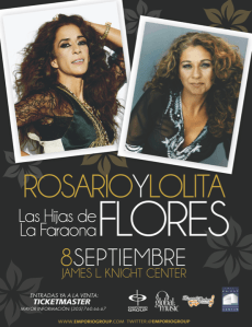Ago. 8, 2012: Después de muchos años, las reconocidas artistas Lolita y Rosario Flores, se vuelven a juntar para una noche inolvidable. Miami se prepara para recibirlas por la “puerta grande” éste próximo 8 de septiembre en el James L Knight Center de la ciudad de Miami.