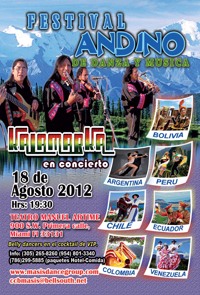 Ago. 16, 2012: El conjunto de músicos y cantantes bolivianos Kalamarka estarán presentandose en el X Festival Andino de Danza y Música, el 18 de Agosto en el teatro Manuel Artime localizado en 900 SW 1 Street de Miami a las 7:30 PM.