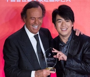 Abr. 4, 2013: El cantante español Julio Iglesias recibe un galardón por ser el artista internacional más famoso de todos los tiempos en China de manos del pianista Lang Lang, durante una rueda de prensa en Pekín (China).