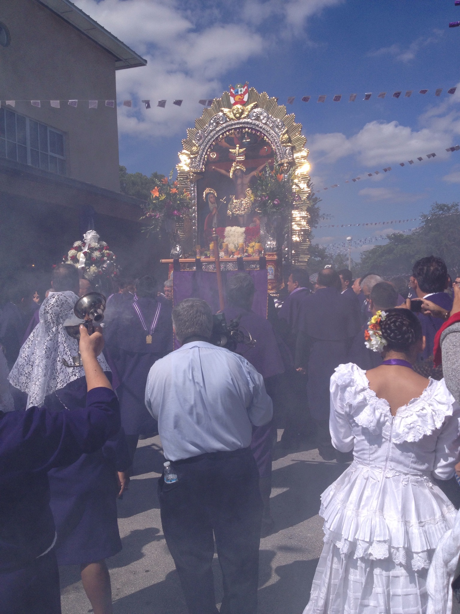 El pasado domingo 19 de Octubre en la parroquia Good Sheppard de Miami, en el área de Kendall, la Hermandad del Señor de los Milagros, los peruanos y algunos latinoamericanos presenciaron la misa, que el templo estuvo repleto de feligreses, hasta algunos tuvieron que estar parados por todo el tiempo de la celebración eclesiástica. Y la procesión se llevó acabo después de la misa, estrenando la réplica del anda que se saca en Lima. Mientras unos seguían a la procesión, dentro de la propiedad de la iglesia, los asistentes disfrutaron de la diversa comida peruana como Anticuchos, Chicharrones, Picarones, Comida Criolla tal como Arroz con Pato, Carapulcra, Ají de Gallina, Seco de Res, y las populares bebidas como Chicha Morada, la famosa gaseosa amarilla-dorada con sabor dulce entre otras.