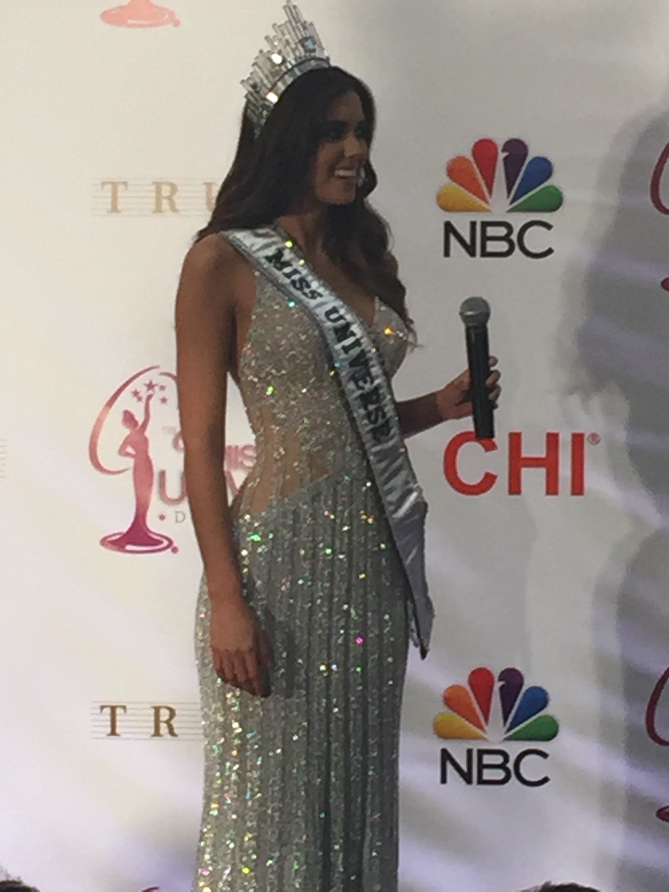 Paulina Vega afirmó que ella es auténtica y que con mucho trabajo y pasión obtuvo la corona. Y así lo demostró ella cuando le preguntan en inglés sobre la nueva corona y contestó pero luego bajó el micrófono un poco diciendo “¿Qué dijo?” y ya aclarada la pregunta respondió la interrogante de la periodista.