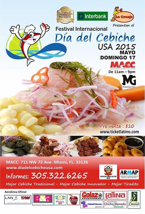 TobienlaTele.com invita y convoca a sus lectores y espectadores del Sur de la Florida a ir este domingo al festival ‘Día del Cebiche’ en MACC (Miami Airport Convention Center) al costado del hotel Double Tree del aeropuerto de Miami, donde la comida y la música se unen para pasar un domingo de cebiche.