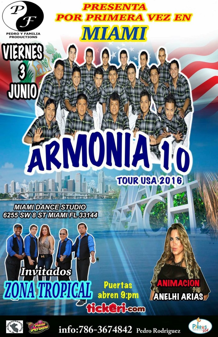 La agrupación de cumbia Armonía 10 vendrán este viernes 3 de Junio en Miami Dance Studio, localizado en 6255 SW 8th Street para deleitarnos con los mejores temas musicales de hoy como ‘Ya Te Olvidé’ y de siempre como ‘Hasta Las 6 de la Mañana’ para los peruanos del Sur de la Florida. Pues Pedro y Familia producciones traerá directamente desde el Perú a la agrupación de Piura que tiene más de 40 años de trayectoria cantando a los peruanos.