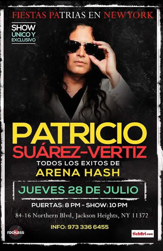 ¡New York, New York! Así cantará en pocos días el recordado músico y cantante peruano Patricio Suárez-Vértiz. El ex integrante de ‘Arena Hash’ viajará a Nueva York para celebrar y presentarse para Fiestas Patrias peruanas junto con sus connacionales e interpretará los mejores éxitos de la agrupación de su hermano Pedro Suárez-Vértiz. Este próximo 28 de Julio se presentará en 84-16 Northern Blvd. en Jackson Heights, New York.