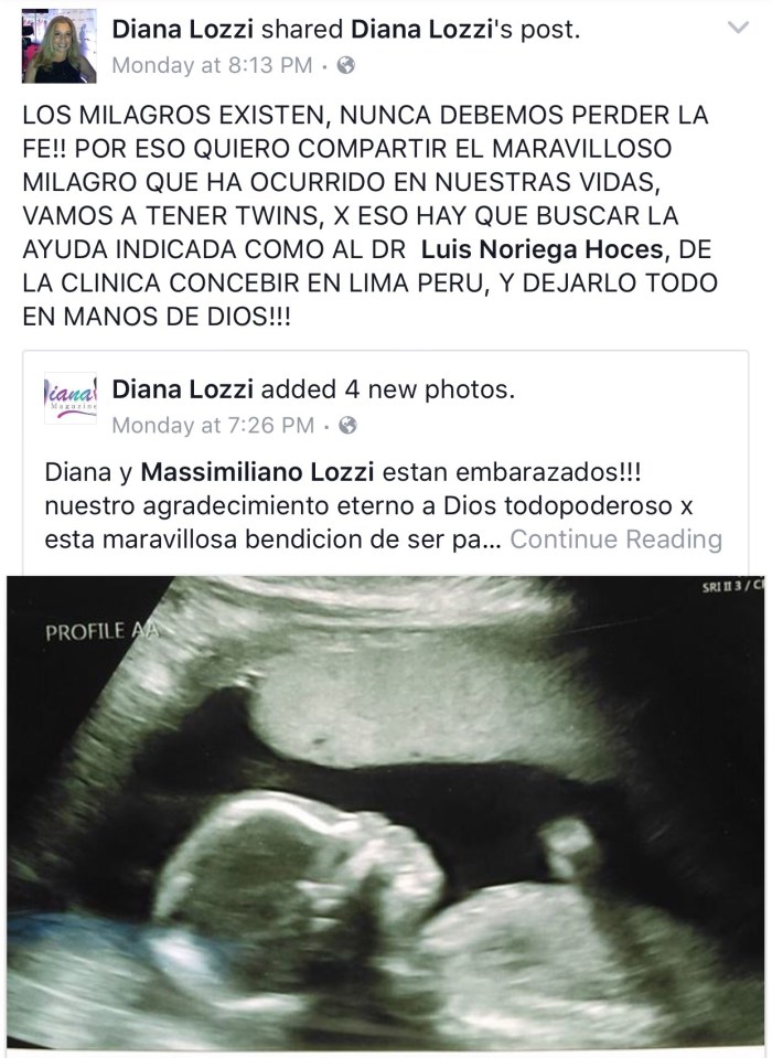 “Vamos a tener ‘twins’, por eso hay que buscar la ayuda indicada como al Dr. Luis Noriega Hoces, de la Clínica Concebir en Lima, Perú y dejarlo todo en manos de Dios,” indicó la conductora de ‘Diana TV Magazine’.