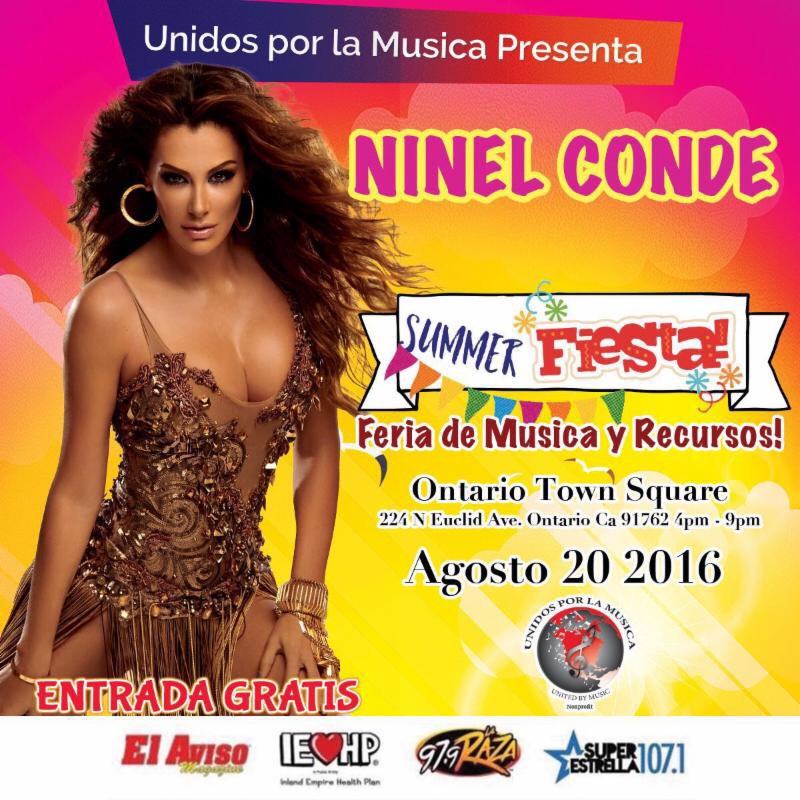 Ninel Conde será la invitada especial de ‘Unidos por la Música, Summer Fiesta!’ en Ontario Town Square Center de la ciudad de Ontario del condado de San Bernardino en California el próximo 20 de Agosto. ‘La Bombón Asesino’ llegará desde México para animar y cantar a los hispanos que viven en San Bernardino.