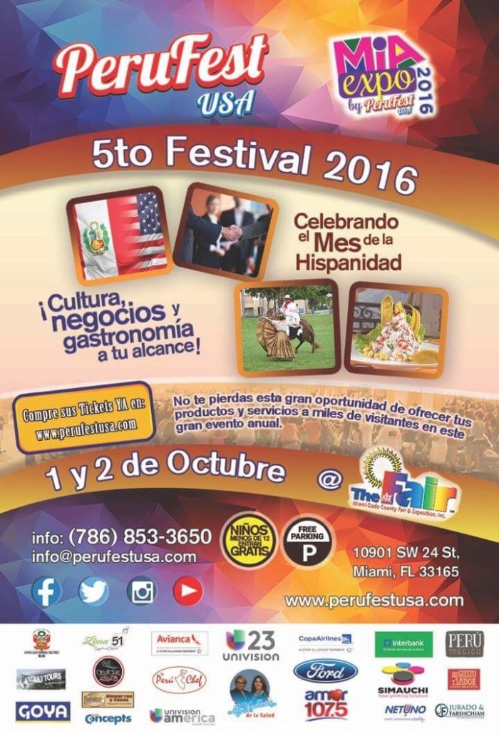 Sólo falta días para el gran festival des gastronomía peruana en la Ciudad del Sol. Los peruanos de Miami y la comunidad Latina en el Sur de la Florida podrán degustar los mejores platillos del Perú, Como los populares ceviches, lomo saltado, causas rellenas y muchos más. Asimismo, El entretenimiento en Perufest USA no faltará en estas dos fechas 1 y 2 de octubre en Miami Fair Expo.