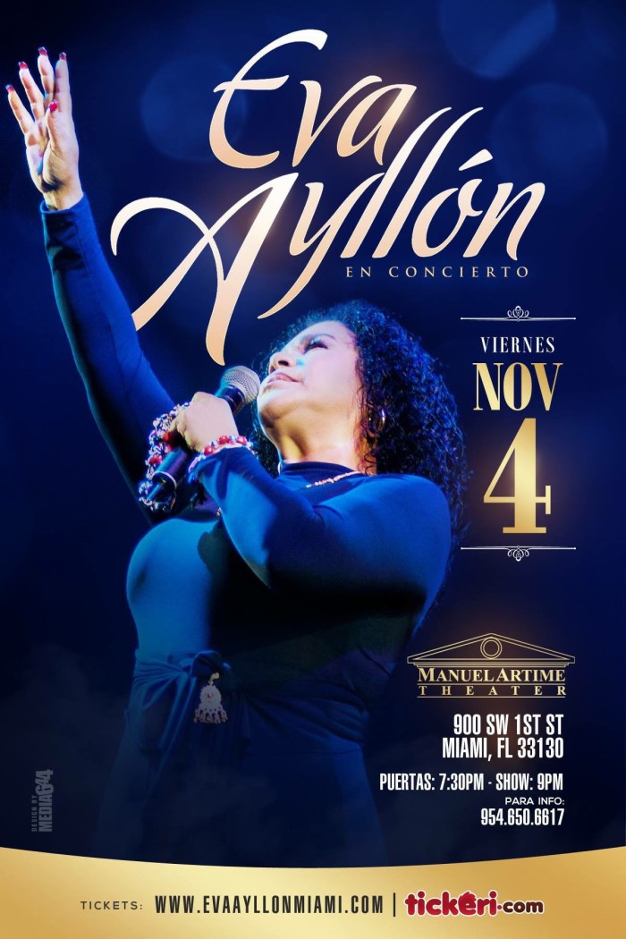 La gran cantante peruana de música criolla (música tradicional peruana), no minada varias veces al Grammy Latino pisará suelo miamense para dar concierto a los peruanos de Miami y del Sur de la Florida. Eva Ayllón culminará una gira por las principales ciudades de Estados Unidos como New York, New Jersey, Los Angeles, Washington y en Miami termina el tour. La cantante criolla se presentará el próximo viernes 4 de Noviembre en el Manuel Artime Theater.