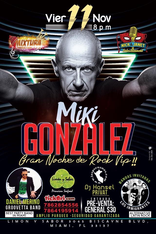 Una noche de rock peruano de los 80’s. Miki González regresa a Miami el próximo viernes 11 de Noviembre en el restaurante peruano ‘Limón y Sabor’, localizado en 3045 Biscayne Blvd para tocar sus mejores éxitos como ‘Akundun’, ‘Vamos a Tocache’, ‘Dímelo, Dímelo’.