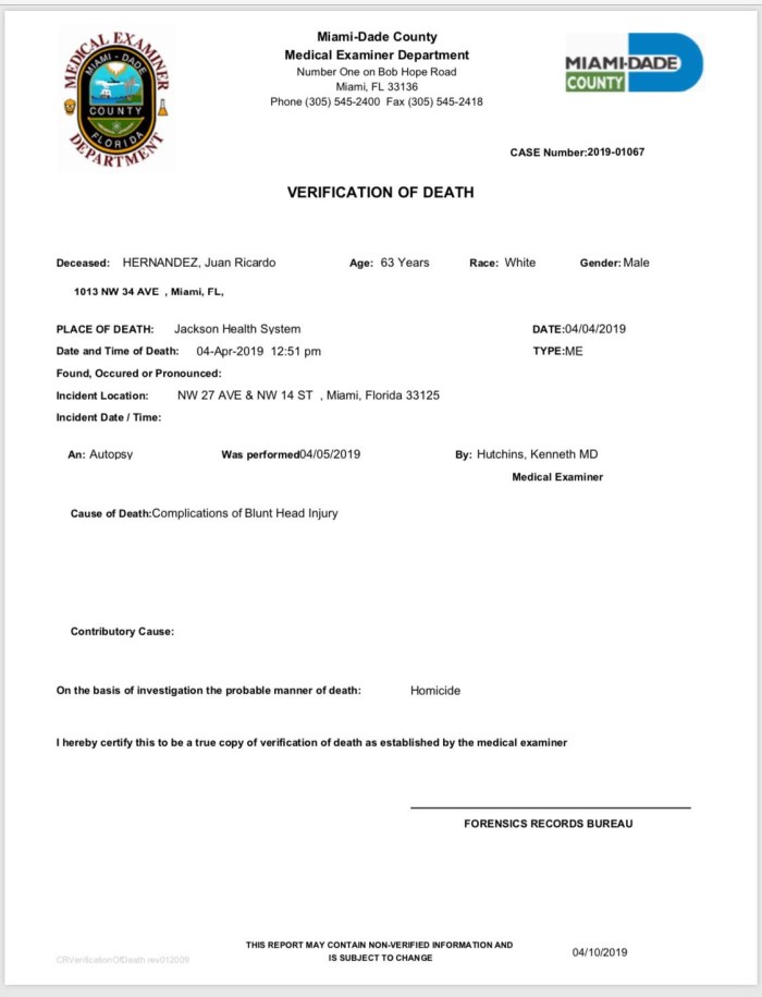 El pasado miércoles 10 de abril, se tuvo conocimiento sobre el reporte médico forense del Departamento de Salud del condado Miami-Dade, en la cual indica las causas del fallecimiento de Juan Ricardo Hernández, el hombre cubano de 63 años que fue abatido por el actor mexicano Pablo Lyle el domingo 31 de marzo en la ciudad de Miami.